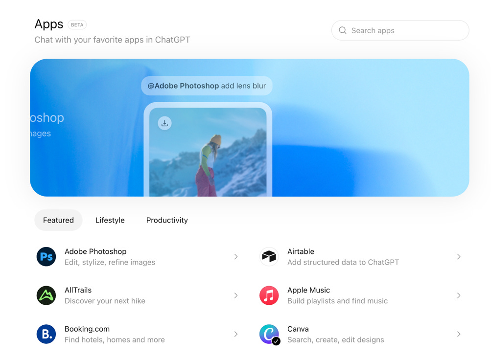ChatGPT now has an app directory where users can browse and add approved apps (including what used to be called “connectors”).