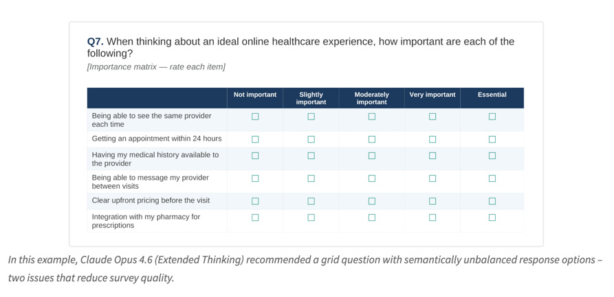 AI is strong at the surface-level stuff: clear phrasing, logical sections, clean formatting. Where it struggles is the judgment calls that separate “fine” surveys from ones that produce reliable, decision-worthy data.