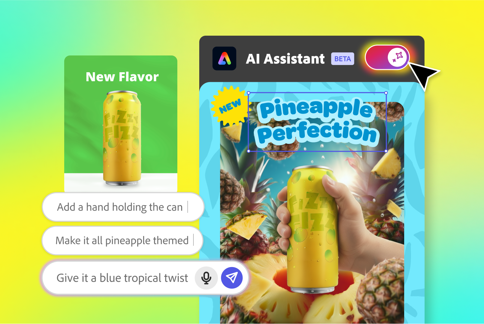 • AI Assistant in Adobe Express launches in public beta; edit by chatting (“make it more tropical”).
