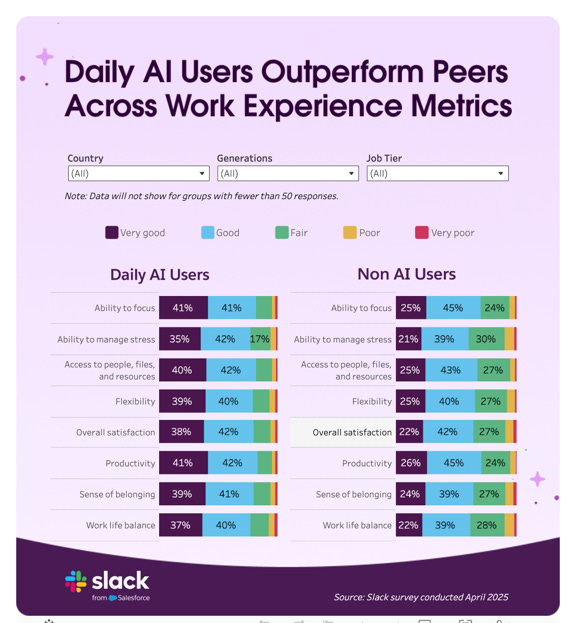 According to a June 2025 Slack Survey, Daily use of AI tools by workers in offices jumped up by 233% in the first six months of the year. Workers who use AI every day are 64% more productive and 81% happier with their jobs.