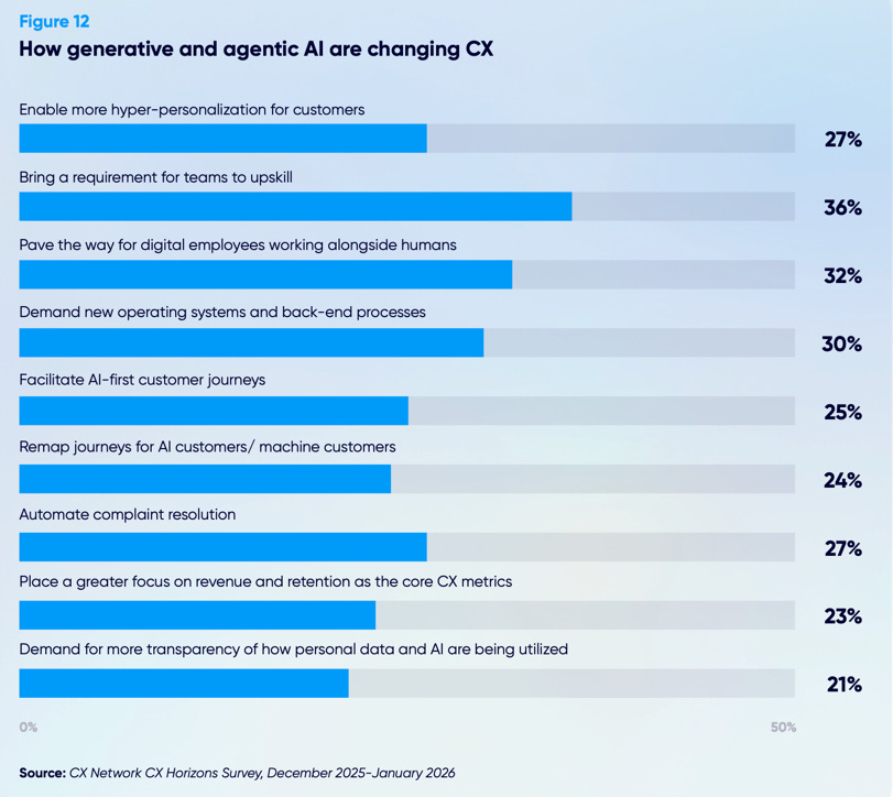 The report’s horizon section pushes this even further: CX leaders acting as experience architects and trust stewards, responsible for human‑to‑machine and machine‑to‑human interactions, AI governance, and how data, channels, and workflows actually connect.