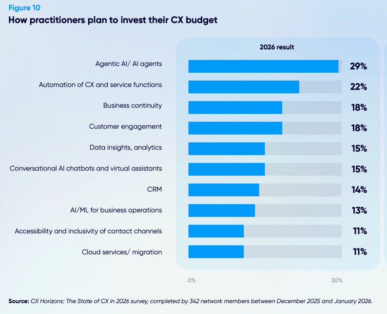 Agentic AI and AI agents emerged as the top investment priority for 2026, followed by the automation of CX and service functions. A big share of practitioners expect spending on generative AI, agentic AI, and digital CX to rise this year.
