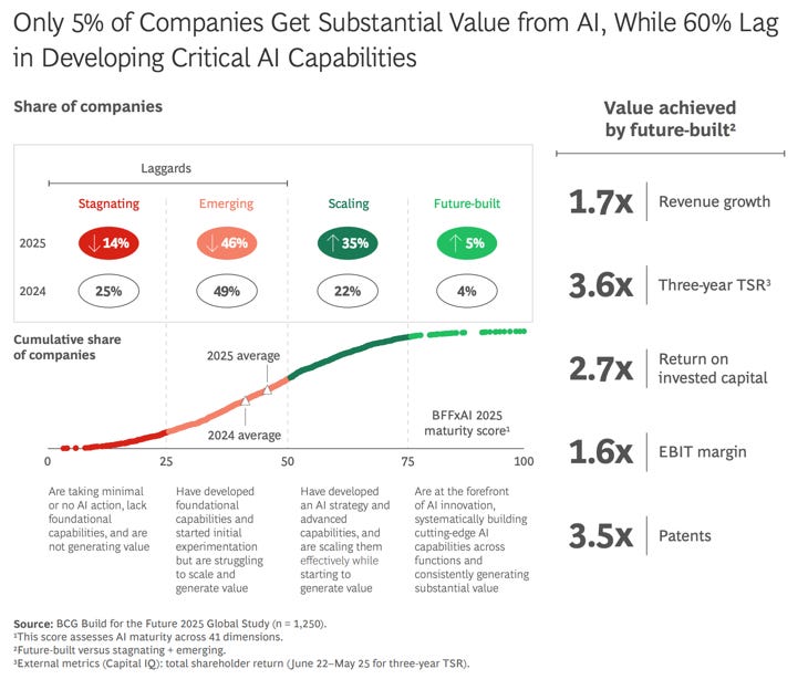 A recent Boston Consulting Group (BCG) report shows only 5% of companies are capturing significant value from their AI investments, while nearly 60% report minimal impact despite large deployments.