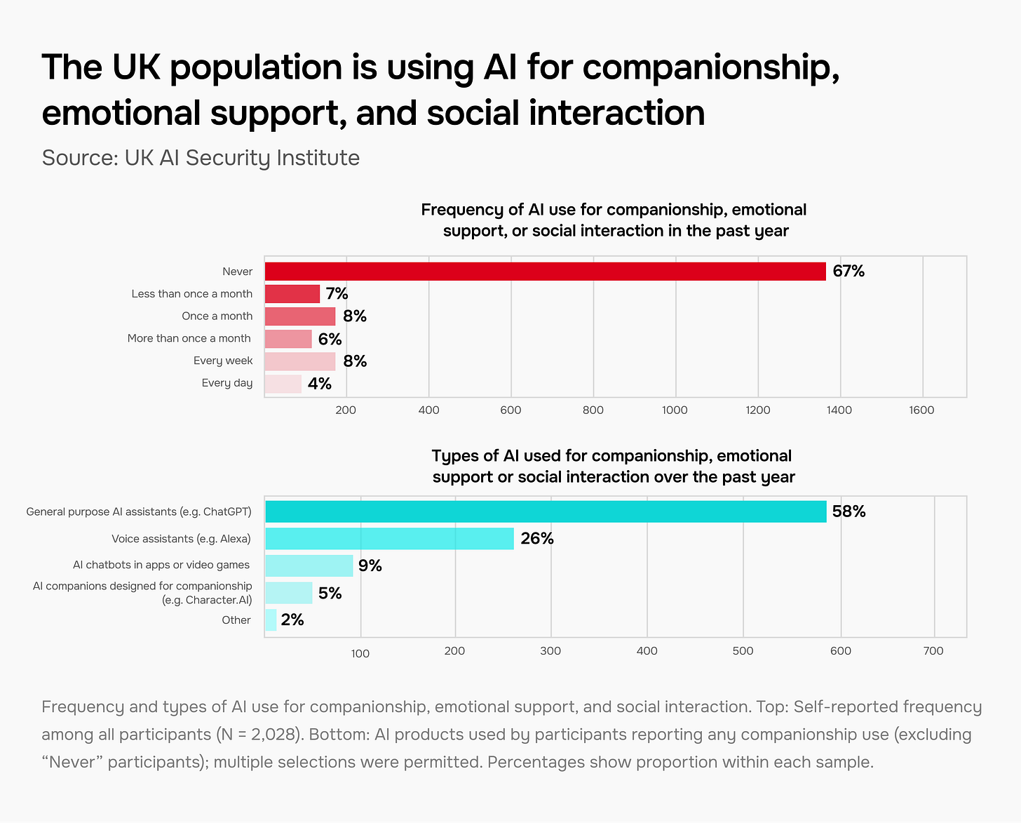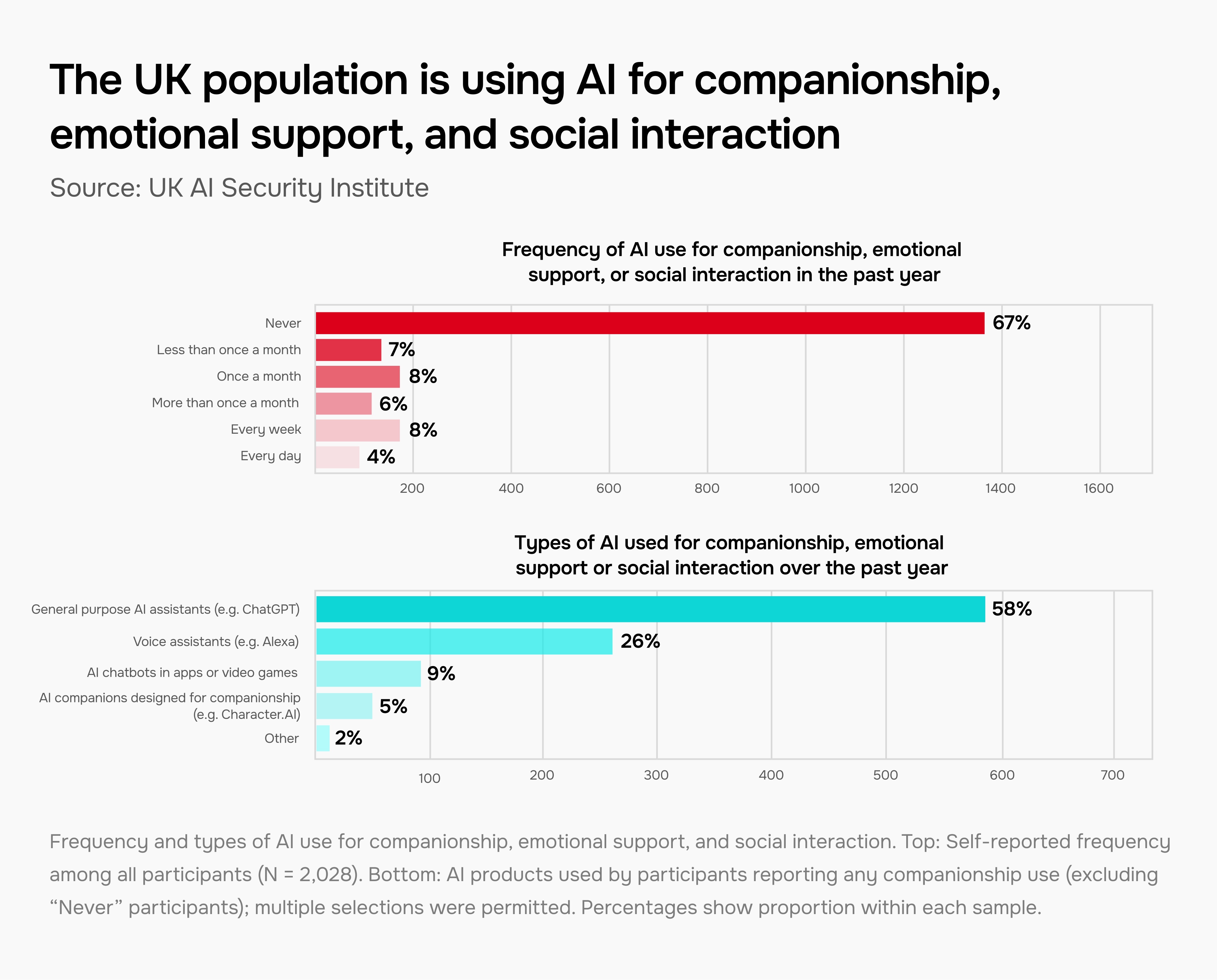 33% of UK participants said they used AI for companionship, emotional support, or social interaction in the last year (N=2,028).